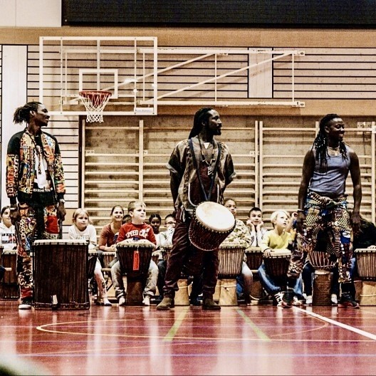 Mit einem kurzen, mitreissenden Trommelfeuerwerk wird dieser einmalige Kulturtag eröffnet. Anschliessend haben die Schülerinnen und Schüler die Gelegenheit, in drei verschiedenen Ateliers Trommelrhythmen, Tänze und Lieder aus Westafrika zu erleben. Jede Gruppe durchläuft alle drei Workshops. So erhalten alle einen umfassenden und authentischen Einblick in die westafrikanische Musik- und Tanzkultur. Beim grossen Finale performen alle Gruppen gemeinsam mit den Profis, und der Kulturtag findet so einen fulminanten Abschluss.