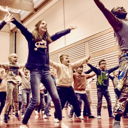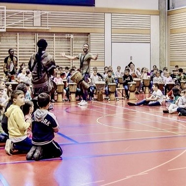 Im Workshop mit dem ganzen Schulhaus singen, tanzen und trommeln