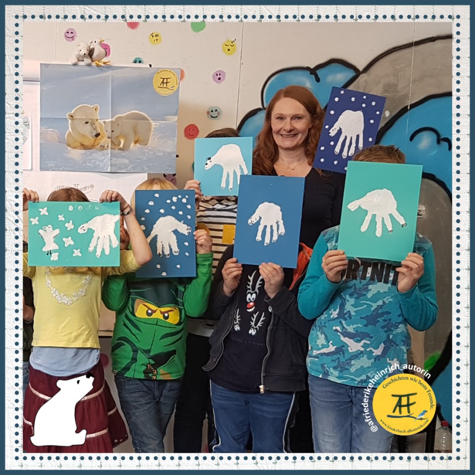 Bei einer gestalterischen Arbeit vertiefen wir im Anschluss das Themenspektrum Klimawandel, Arktis und Polartiere.