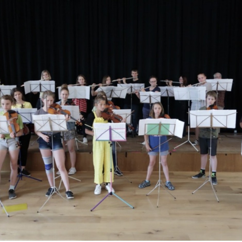 Schüler und Schülerinnen musizieren für ihre Mitschüler und Mitschülerinnen.