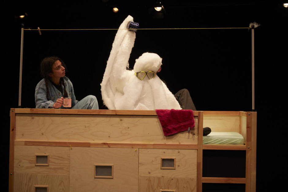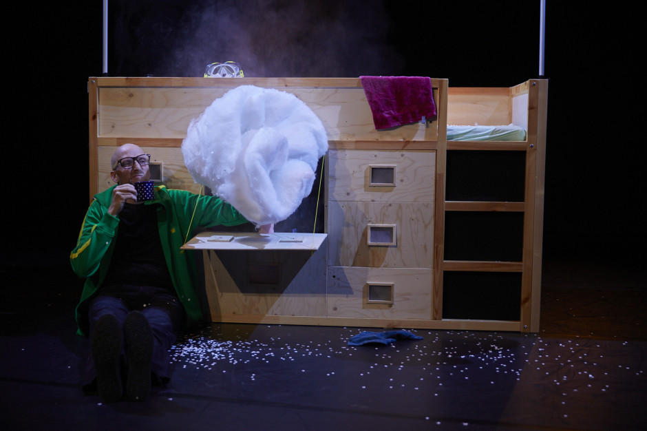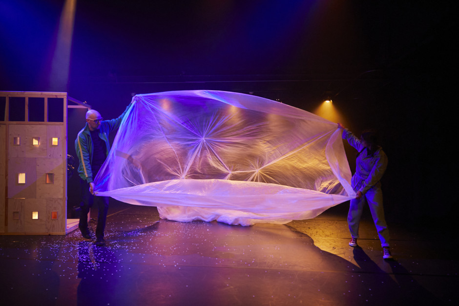 Ein Stück über seltsame Ereignisse, eigenwillige Luftschlösser und produktives Chaos. Über den Umgang mit Geheimnissen und den produktiven Effekt einer ungewohnten Situation: Was tun, wenn man auf sich allein gestellt bist? Wie Konflikte und Herausforderungen in der Familie meistern? Eine Bewegungsschauspielerin und ein Figurenspieler erzählen die abenteuerliche Geschichte ohne viele Worte, dafür mit Körpereinsatz, Wasser, Watte und Trockeneis.
